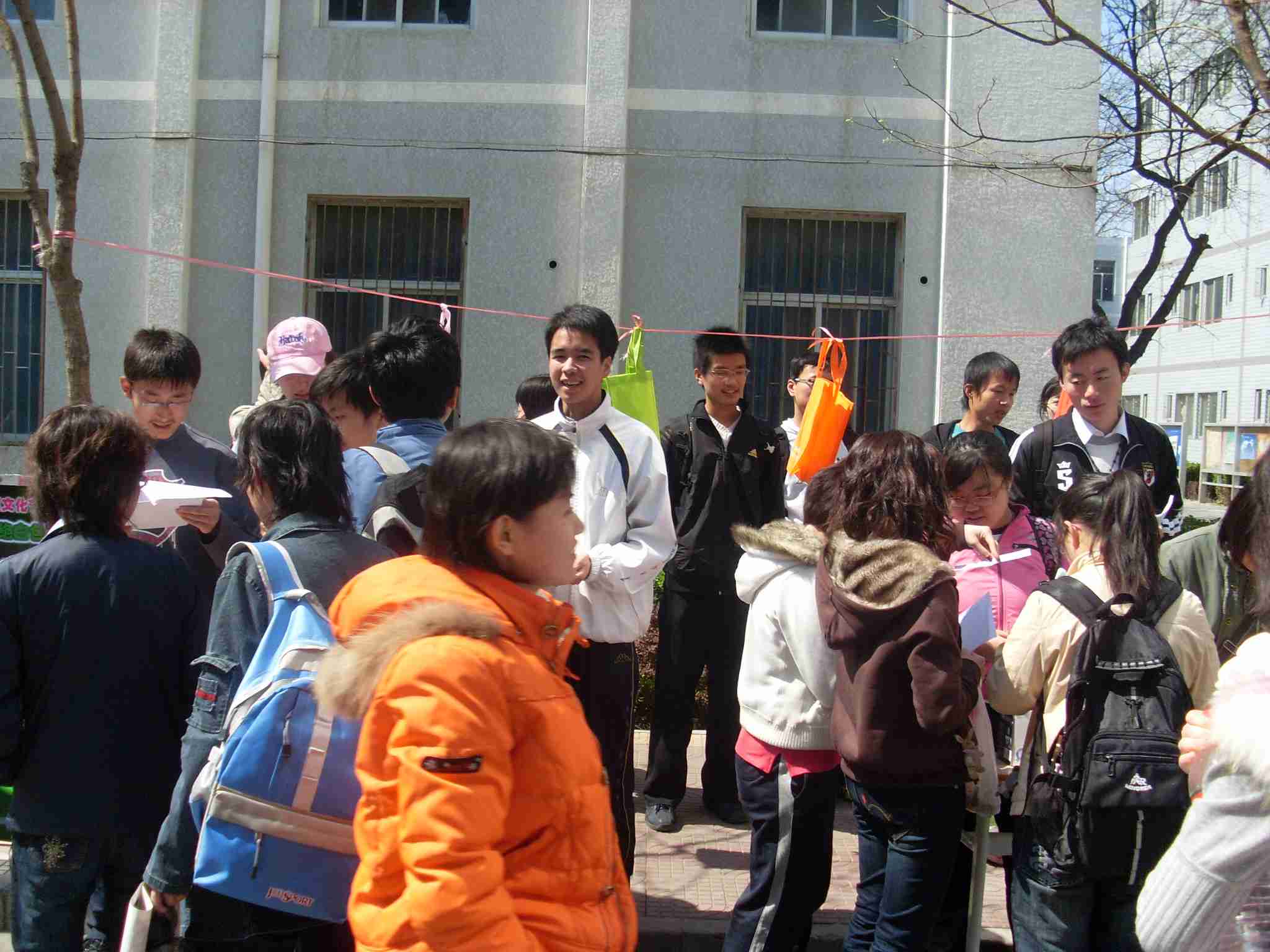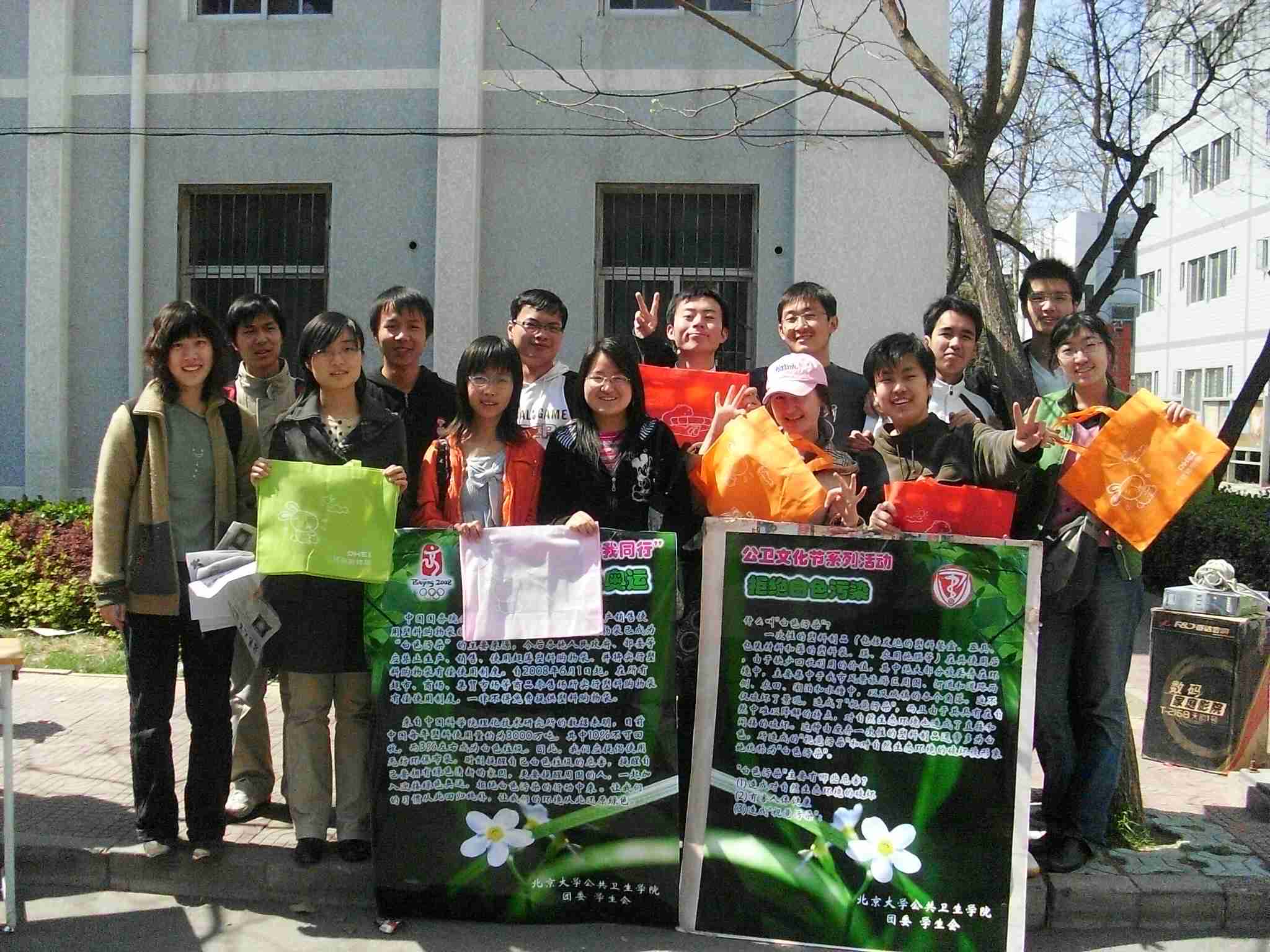 为了迎接即将到来的08年北京奥运会,宣传“绿色奥运”,从2008年6月1日起北京各大超市将不再提供免费塑料袋。 4月2日中午,公卫学院学术文化节之“迎接绿色奥运,拒绝白色污染”活动在5号楼前火热进行,答题者从题目箱中随机抽取题目,当场作答,答对者获得布袋一个,此项活动吸引了众多同学的驻足参与。五彩的布袋,漂亮精致的“公卫学术文化节”海报,伴着同学们“答奥运问题,赢环保布袋”、“轻松答题,快乐领奖”的宣传,更有获奖者惊喜的呐喊,这一切让本来安静的校园顿时充满了生机,充满了欢笑。不到半个小时,所有环保布袋就已都发送完毕。