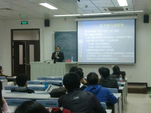 在日本地震引发的福岛核电站危机发生之后,为了让同学们更加深入地了解核问题以及核技术的应用,2011年3月31日晚6:30,北京大学基础医学院团委联合北京大学医学部保卫处,在逸夫楼310教室举办了“关注东亚地震,树立安全意识,开拓个人视野”系列活动之二—— “走近核医学——核技术应用”讲座,本次讲座的主讲人是北京大学医学部核医学系主任、北京大学第一医院核医学科主任王荣福教授。基础医学院党委副书记郭琦,基础医学院学生办公室主任、团委书记赵姗等出席了这次讲座。