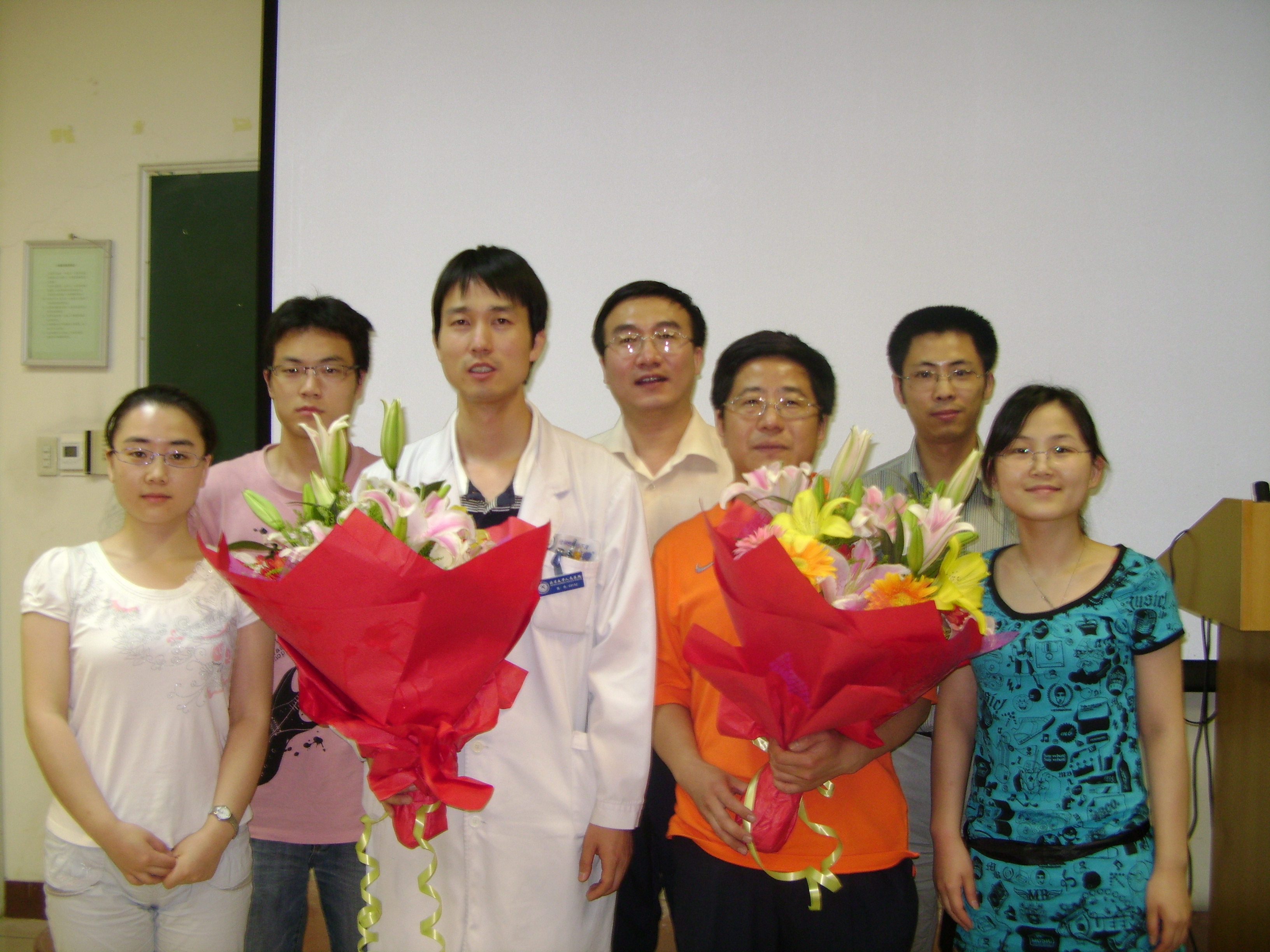交流会中,来自四川的学生代表向院领导及医疗队员们表达了他们的感谢之情,并表示将以踏踏实实的工作回报母校。现场的学生以问答的方式与报告会成员进行了思想上的互动与交流,并认真填写了《北京大学人民医院研究生汶川地震心理影响调查表》。最后手捧鲜花的医疗队模范们与广大学生亲切合影留念。