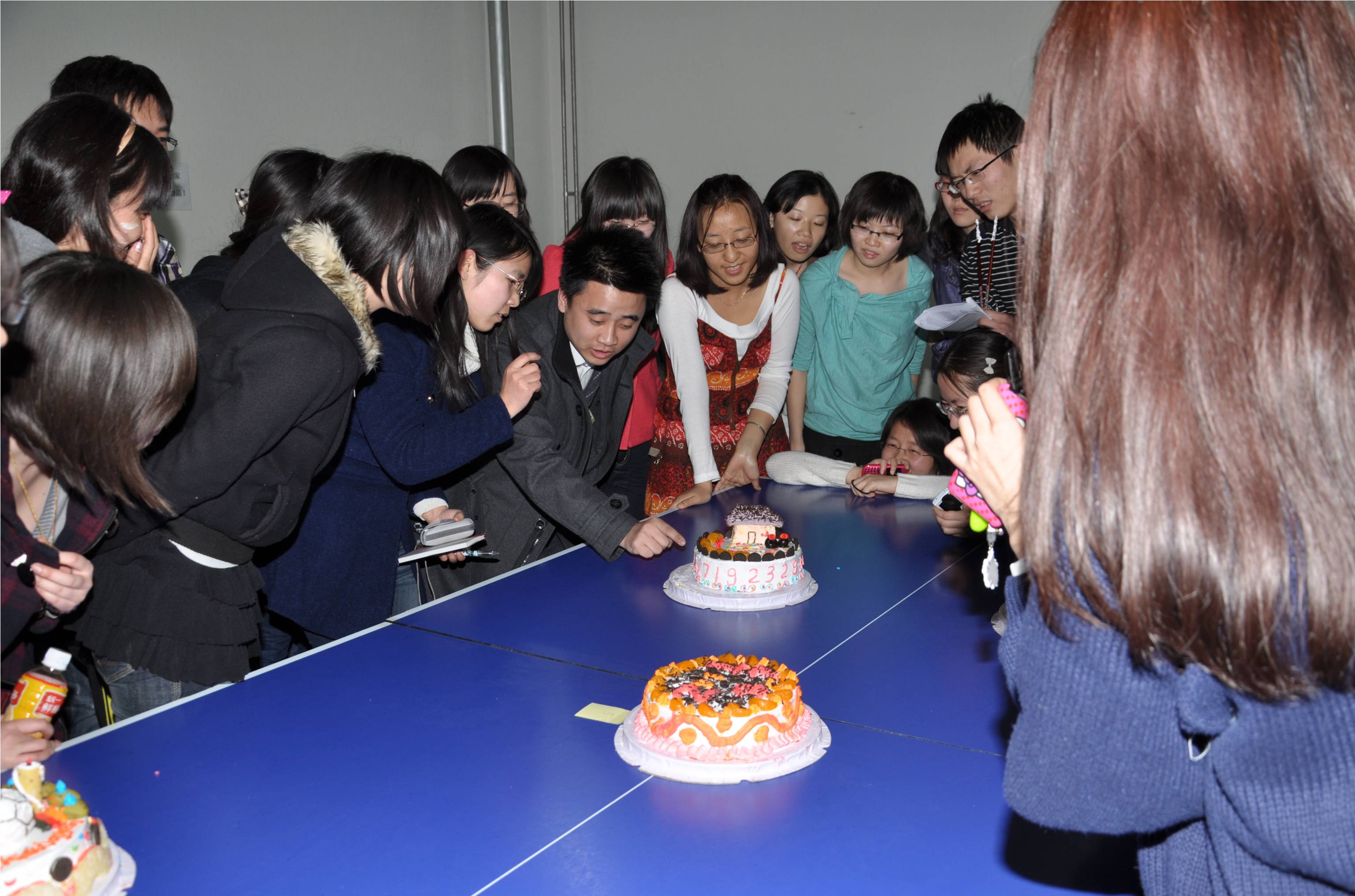 他们有的通过奶油花和水果的数目来暗示女生宿舍号,有的则将女生们的名字融入到五彩斑斓的蛋糕图案中,还有的用“2010”和足球的造型来隐喻在去年世界杯中名声大振的“章鱼保罗”,从而暗指女生们参加的名叫“八爪鱼”的论文翻译工作。男生们独具匠心的构思和天马行空的想象力令人叹为观止。答对的女生们暗自庆幸,答错的女生则要接受小小的惩罚——被男生们用奶油在脸上画上“2”字,并且要用嘴接住舍友抛出的樱桃。全场掌声雷动,欢声笑语接连不断,将活动的气氛一次又一次推向高潮。
