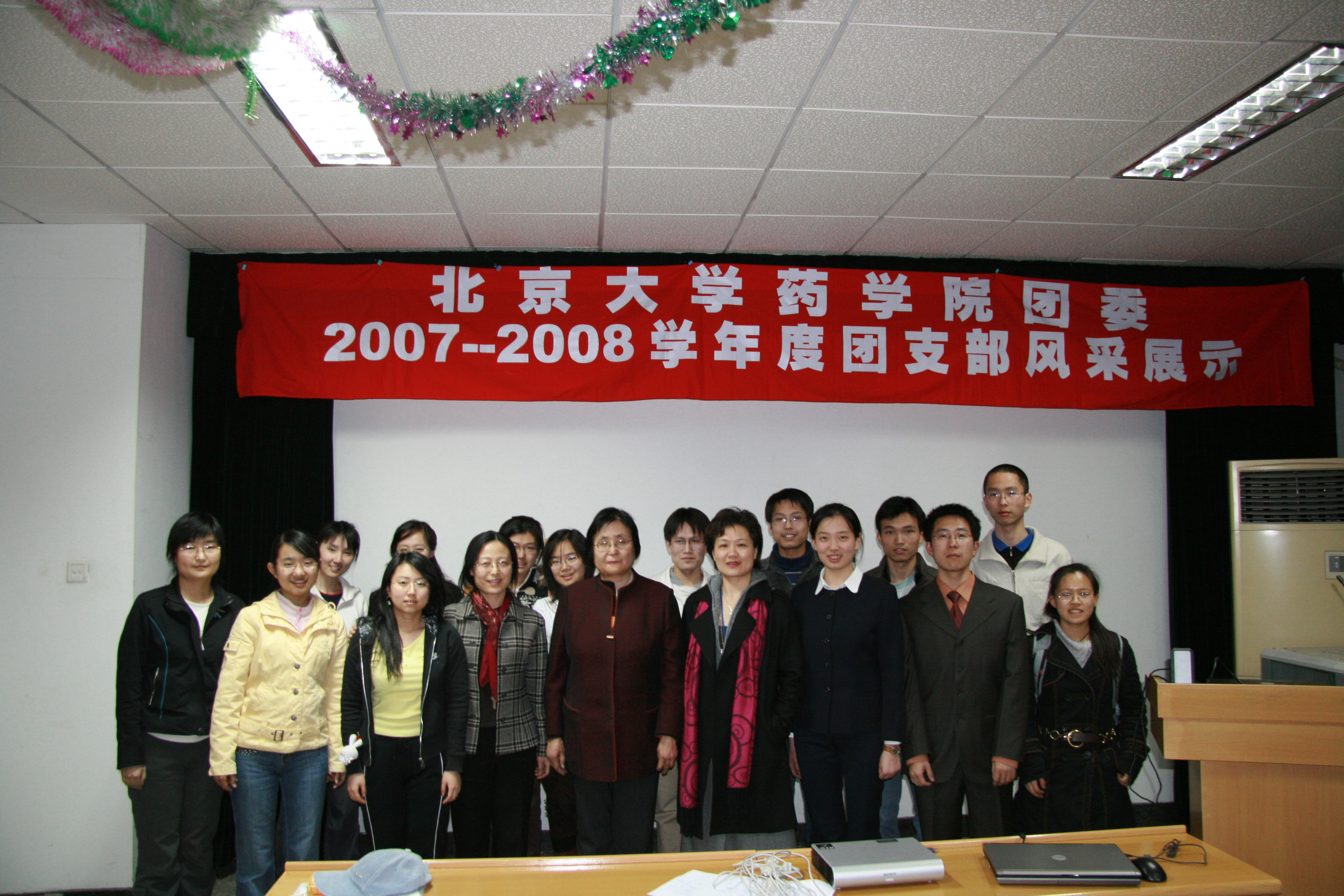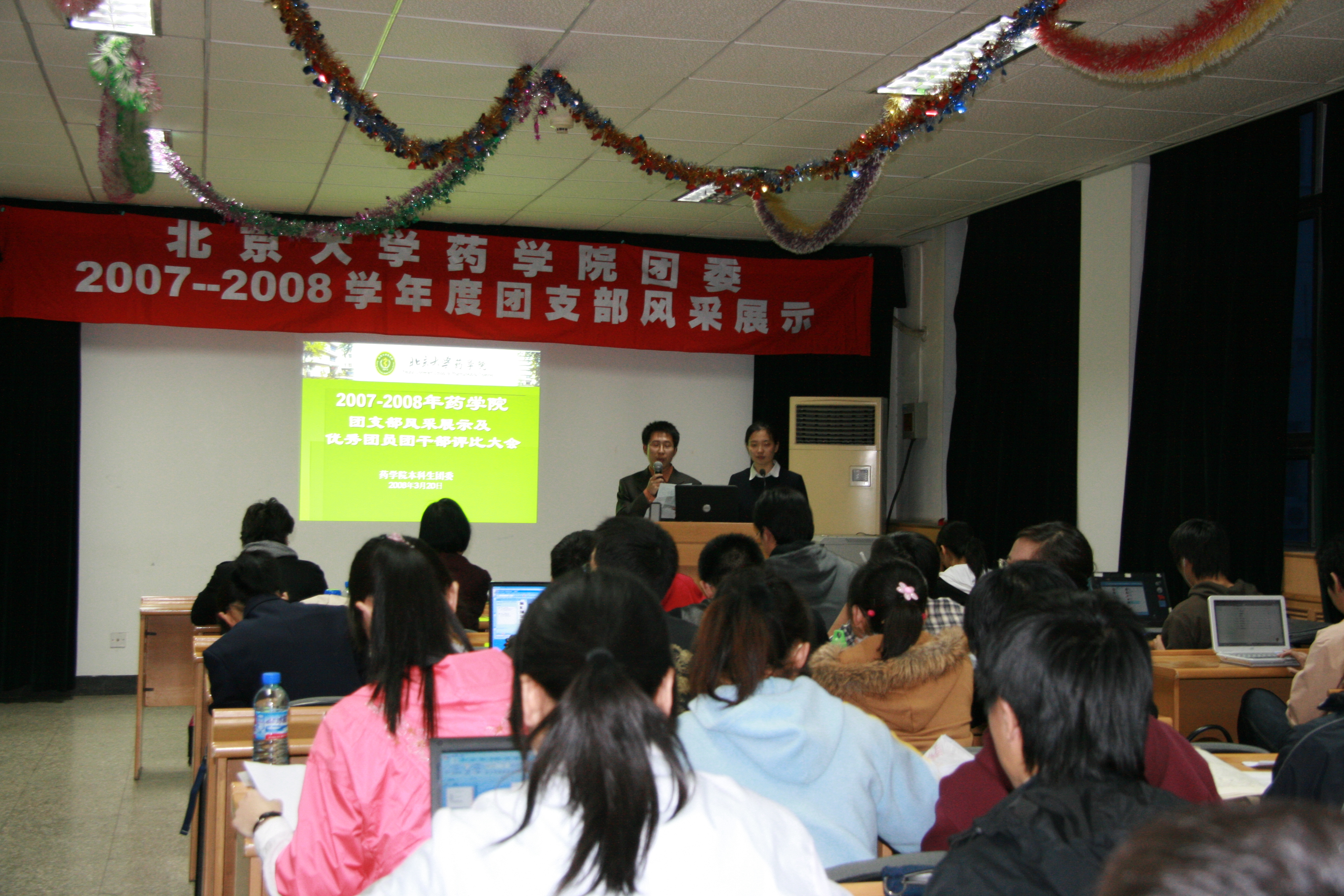药学院团委一直以来都充满着青春与活力, 2007年4月至2008年3月,药学院团委组织了很多丰富多彩、寓教于乐的活动:学习十七大主题团日、我心中的北大征文、价值观论坛、十七大征文……十几个支部踊跃参与,各展雄风。正如同秋天累累果实需要收获一样,各支部也要将自己努力的结晶呈现给大家,将支部最美丽的风采展示出来。于是,药学院团委于2008年3月20日,在药学楼报告厅举行了2007-2008团支部风采展示及优秀团员、团干部评选大会。