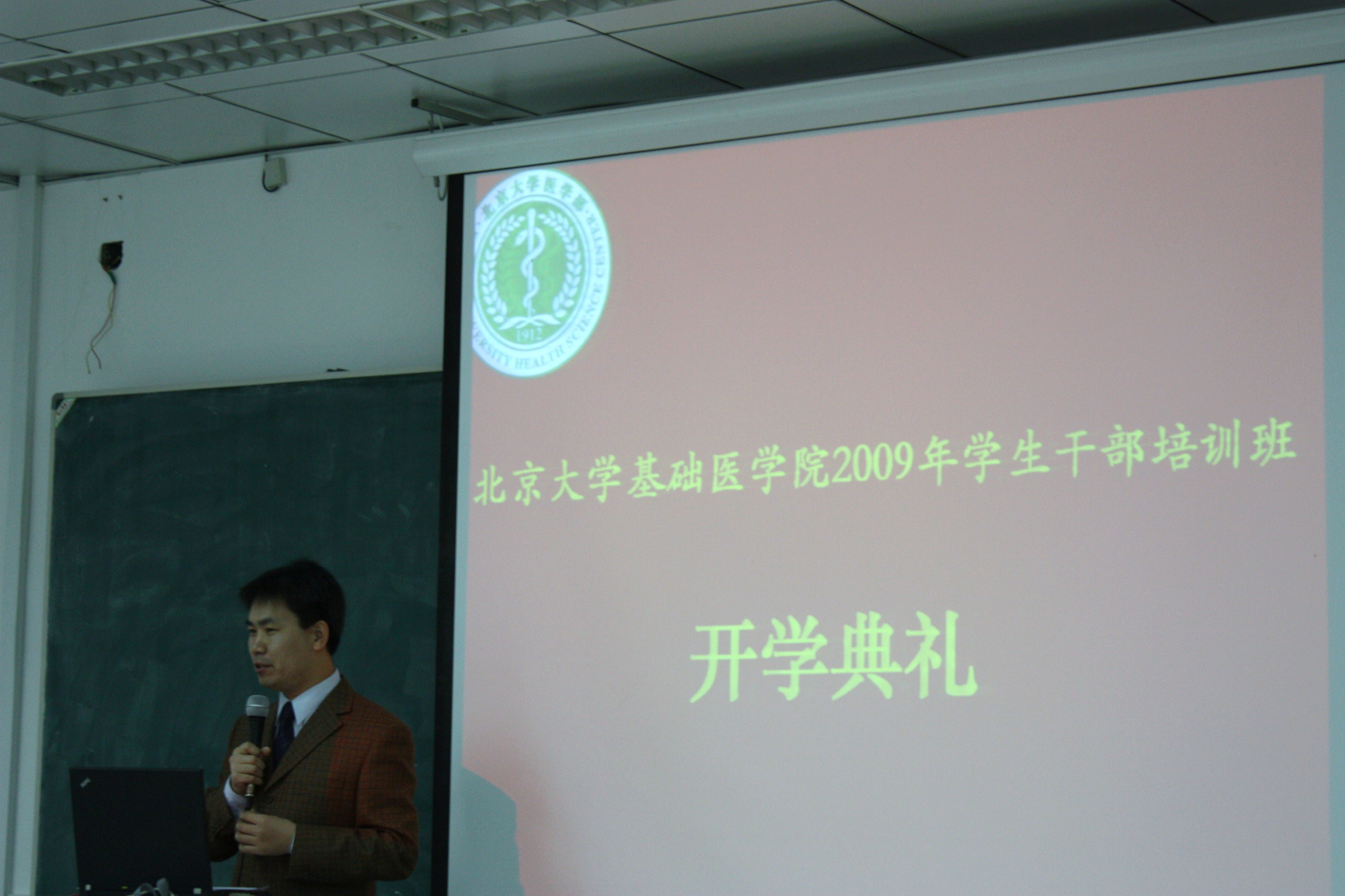 为了培养具有坚定共产主义信仰、善于思考、勇于实践的青年马克思主义者,为了增强学生干部们人性化管理能力,同时作为向未来基础医学院团校的过渡,由北京大学基础医学院团学联组织部主办的“北京大学基础医学院2009年学生干部培训班”顺利举行开学典礼。本次活动有幸邀请到了医学部党委组织部副部长苏鸿,医学部团委副书记焦岩,基础医学院党委副书记郭琦和基础医学院团委书记赵姗。参加干训同学是基础医学院08级各团支部书记、组织委员、宣传委员、各班班长以及基础医学院团学联各部骨干成员。