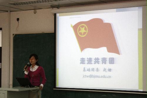 经过短暂的休息,第一次干训紧接着在409教室拉开了帷幕。基础医学院团委书记赵姗老师为大家主讲了团支部的建设。通过赵老师的讲授,大家对基础医学院团委的设置有了进一步的了解,对团支部的建设有了全面的认识,团支部书记、组织委员、宣传委员都明确了自己的工作任务。同学们也对共青团活动的特点和工作方法有了自己的体会。在赵老师演讲后,来自06级临床一班的班长李浙民根据自己的工作经验和体会与同学们进行了交流。他向同学们强调了工作激情的重要性并跟同学们分享了班级工作中的几点注意事项。第一次的干训活动使同学们受益匪浅。