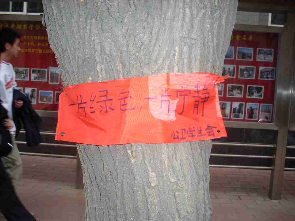 公共卫生学院团委、学生会在植树节当天,在医学部校内开展了以“关爱草木,从身边做起”为宗旨的宣传活动,分别在学校主干道(逸夫教学楼、解剖楼、操场和学生食堂)两侧的树木上扎上了标有保护树木、爱护树木的标语,标语内容丰富多样,语言风格活泼向上,我们希望以这种简单的方式呼吁每一个北医学子爱护身边的一草一木,为绿色和谐履行自己应尽的义务。