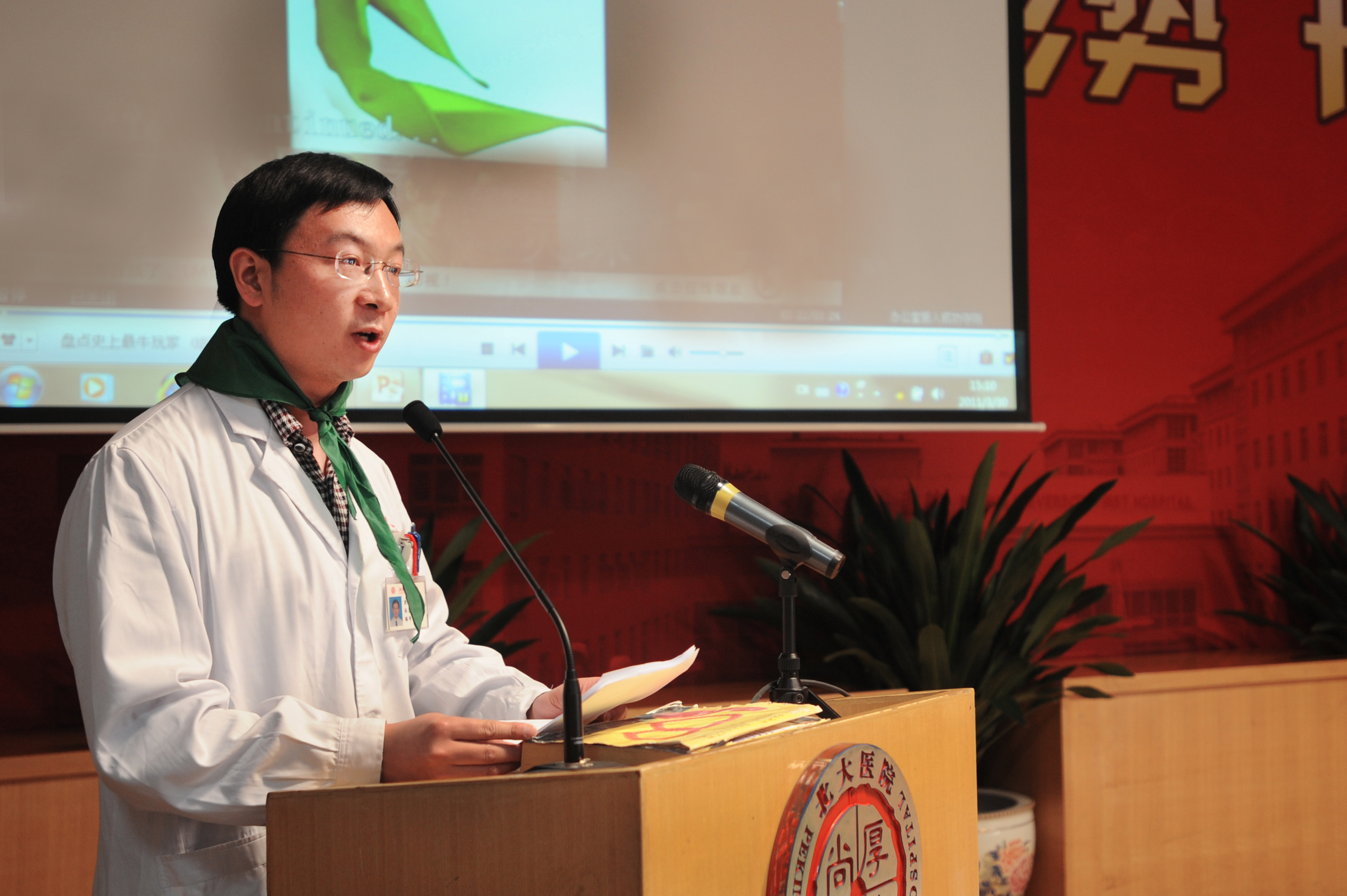 启动仪式的现场还请来了两位特邀嘉宾,他们是来自中央电视台新闻频道《朝闻天下》和《午夜新闻》的年轻主播胡蝶和严於信。早晚忙碌的他们虽不是学医出身,但对于健康传播的理念有媒体人独到的见解。胡蝶女士佩戴“绿领巾”走上讲台,与我院青年医务工作者共同分享志愿精神的真谛。