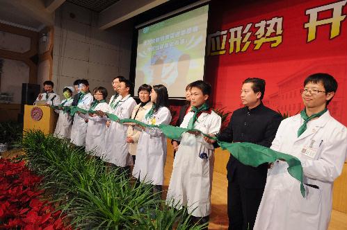 “授白大衣仪式”是我院创始并已坚持十余年的经典活动,是医院为每一名医学生准备的一份神圣的“见面礼”。在本次启动仪式上模仿“授白大衣仪式”举行了“授绿领巾仪式”,刘玉村院长和医学部团委阮草书记为我院健康促进志愿者代表授予“绿领巾”,为我院青年志愿者的健康促进工作赋予了新的寄托:用自己的智慧与汗水无愧于这象征着青春与生命的绿色!志愿者代表孙艺谋同学讲述了自己参与健康促进志愿活动的经历,表示将以更饱满的热情投入到志愿服务中去。