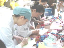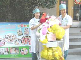 6月3日和4日中午,我们在食堂门口摆放了桌子和主题展板,开始接收爱心玩具和卡片。在现场,我们收到外科病房一名护士非常漂亮的爱心玩具,后来别人告诉我们,她连中午饭都没有顾上吃,就急忙忙去外面买玩具送给小朋友;病理科的一名工作人员对我们说:“我今天把自己家的玩具都带来了,婆婆家还有我的玩具,如果时间可以延长一些,我周末还可以带一些”;手术室的工作人员代表拉来满满两袋子玩具;儿科集体捐赠的玩具中有一个非常特别,引起我们的注意,那是一个非常大的毛绒玩具,护士告诉我们:“这是活动第一天一个看牙的小病人知道了你们在做爱心传递活动,第二天他就特意把家里最心爱的玩具带给我们,请我们转交给你们”;二门诊的老师打电话给我们,说:“我们得到消息以后,马上到你们这里来取爱心卡片并发给各个科室,大家拿到卡片后都非常认真填写祝福和鼓励的话语,并且愿意把家里最新的玩具送给灾区的孩子,我们的行动可能晚一些,所以可不可以4号送来,这样大家都可以把爱心表达出来”……每一个在场的志愿者都为大家的善行深深感动着,我们更深刻地体会到我们医院汇聚的团结力量,这种力量让我们彼此温暖,竭诚互助!每一个关注爱心传递的人,我们都在他们胸口别上了绿色丝带,因为绿丝带是绿色通道的象征,它们也象征军绿子弟兵、绿色生命体和希望地平线!我们让绿丝带传递爱心和希望!我们知道,尽管现在不能到达灾区现场,但是每一个参与传递爱心的人都在抗灾最前线,每个人心中都有一条绿丝带!”