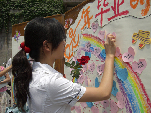 形式简单而新颖,同学们借此表达自己的心声,写下想对亲人、老师、朋友或恋人说出的话,同时又恰逢毕业之际,很多毕业生们也在“又是一年毕业时”那块心语板上留下了对未来的期许和对母校及同窗的深深祝福,两块大大的心语板很快就被同学们的心语装点得分外鲜艳美丽。每位留下心语的同学都领到了一朵鲜花,送给想送的人,活动现场被鲜花、祝福和同学们的笑脸充斥,洋溢着别样的温馨与和谐。